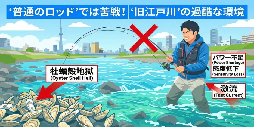「その気持ち、痛いほど分かります! 旧江戸川は『激流』と『牡蠣殻』のせいで、普通のシーバスロッドだと通用しないことが多いんですよ(いわゆる無理ゲー状態)。でも、ロッド選びを変えるだけで世界が変わります!」