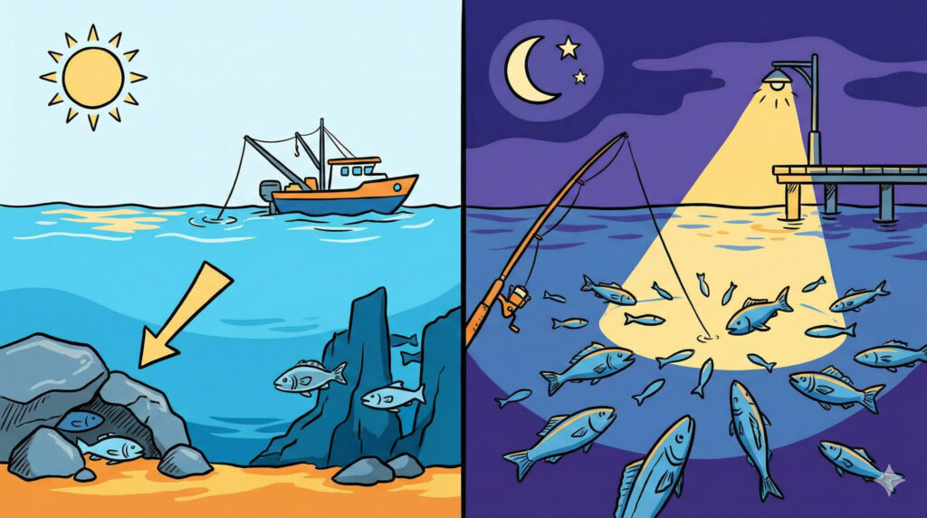 昼間は太陽が高く、光が海中まで届くため、魚は警戒心を強めて深場や障害物の影に隠れています。
