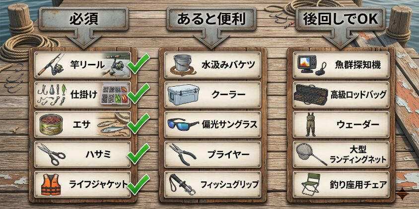 釣りに必要な道具を「必須」「あると便利」「後回しでOK」に仕分け